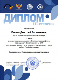 Дмитрий занял 3 место в направлении «Кункурс эссе»СПО-гордость страны» / «Мой выбор — Профобразование» под руководством куратора Мироновой Александры Сергеевны.