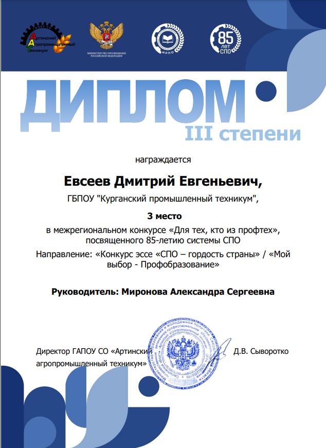 Поздравляем призера Межрегионального конкурса «Для тех, кто из профтех», посвященного 85-летию системы СПО, Евсеева Дмитрия, группа 322!!!