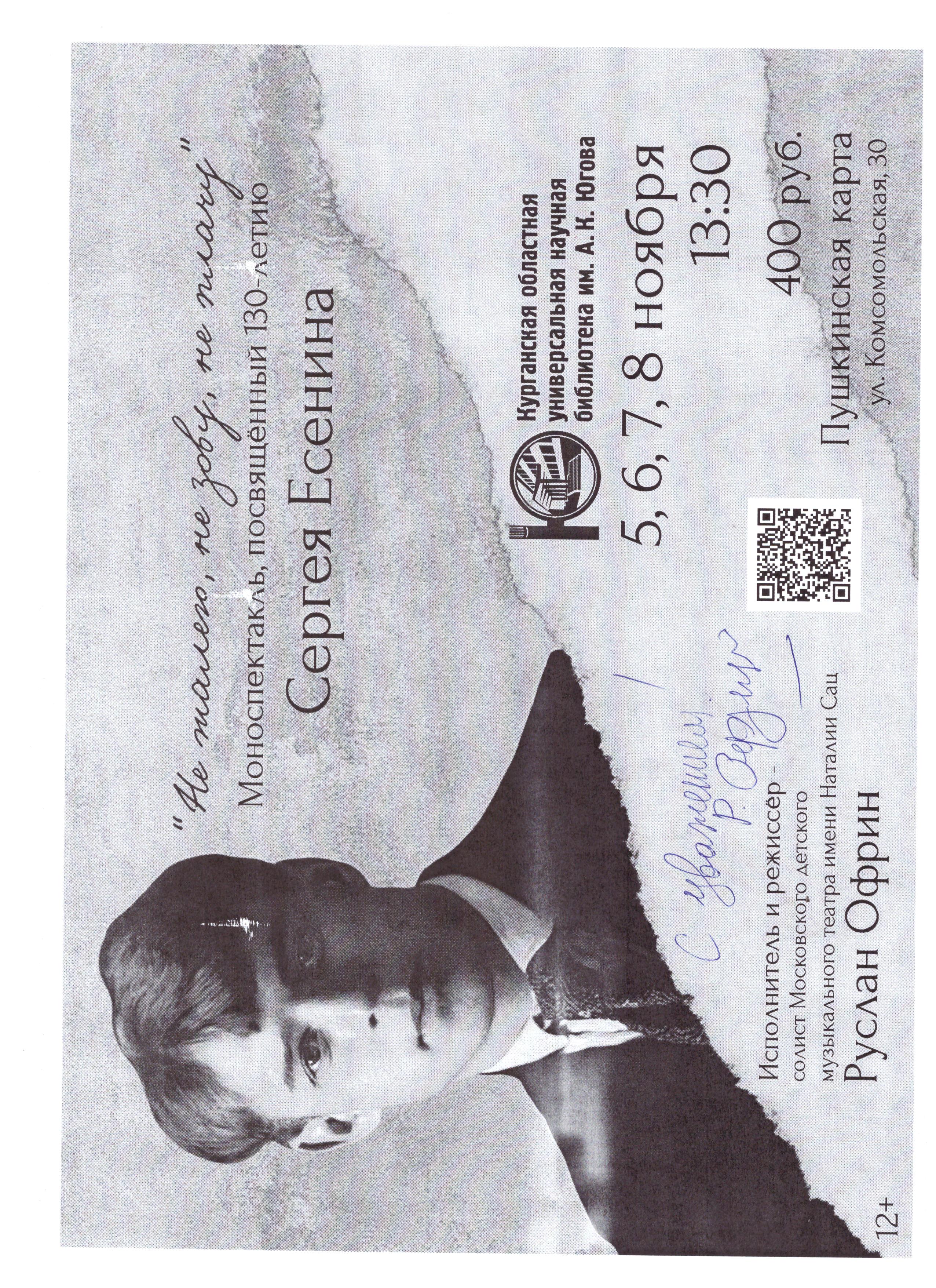 Особую радость и восхищение вызвал моноспектакль у студентов Курганского промышленного техникума. Молодые люди с неподдельным удовольствием слушали проникновенное исполнение стихов и песен Сергея Есенина, открывая для себя новые грани его гения. Встреча с артистом оставила неизгладимое впечатление, а на память о столь значимом событии Руслан Офрин оставил свой автограф на афише, ставшей для студентов ценным сувениром.